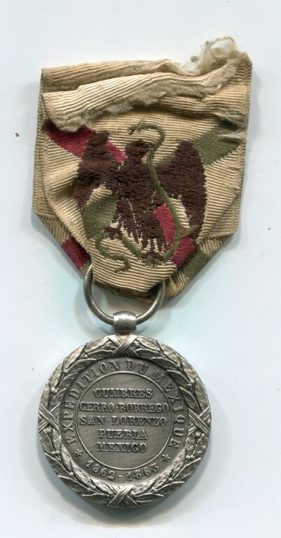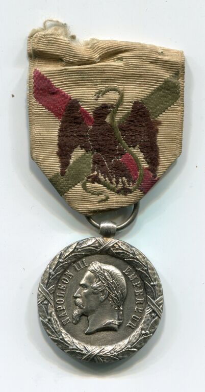 Module 29 mm - tête de Napoléon III lauré profil à gauche dans une couronne de feuilles de laurier - Revers : " Expédition du Mexique 1863 - 1863 " Cumbres - Cerro Borrego - San Lorenzo - Puebla - Mexico " - sur la tranche poinçon Arthus & mention bronze.
