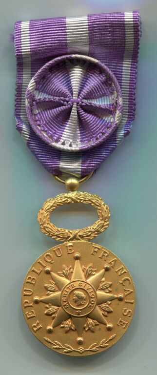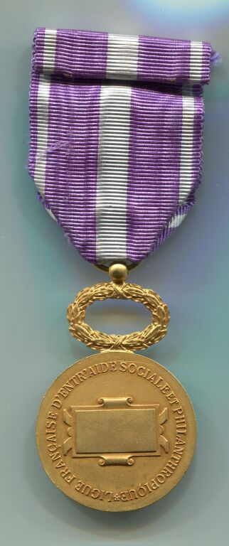 Module bronze doré 34 mm - En centre tête de la République posée sur une étoile à 8 branches bouletées, elle lême posée sur feuilles de laurier ; en pourtour " République Française ". Module surmonté d'une bélière de feuilles de laurier - Ruban : violet bandes blanches avec rosette. AU DOS : " Ligue Française d'Entraide Sociale et Philanthropique ".