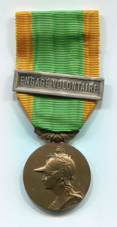 PHALERISTIQUE FRANCE - MEDAILLE des ENGAGES VOLONTAIRES de type Hybride 1920 - Module bronze 1920 surmonté d'une bélière de feuilles de laurier " La France ", profil à gauche, coiffée du casque Corinthien surmonté d'une tête de coq, par RIVET ( * ).