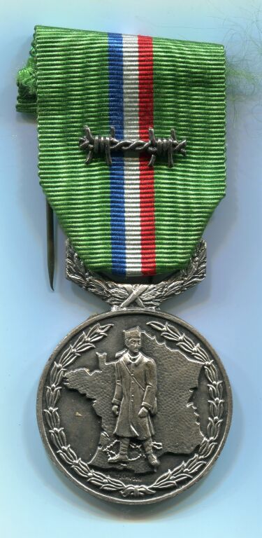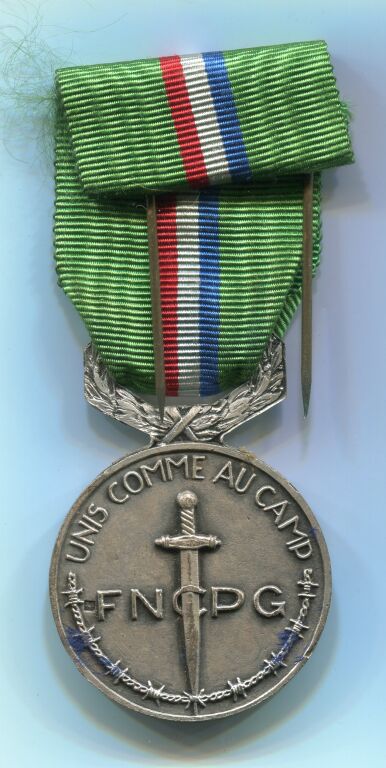 PHALERISTIQUE FRANCE - MEDAILLE FEDERALE du MERITE de la FEDERATION NATIONALE des COMBATTANTS PRISONNIERS de GUERRE ( * ) - Modèle de type 2 créé en 1961 et décerné jusque 1978 : module bronze argenté 32 mm, soldat en manteau long les pieds sur des barbelés sur carte de France entourée de feuilles de laurier. OEuvre du sculpteur TSCHVDIN - au dos : glaive en centre avec lettres F.N.C.P.G., UNIS COMME AU CAMP, barbelés à l'exergue. RUBAN : vert avec bande tricolore en centre et avec comme agrafe fil de fer barbelé (médaille destinée aux combattants de la guerre 1939/45).