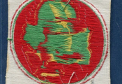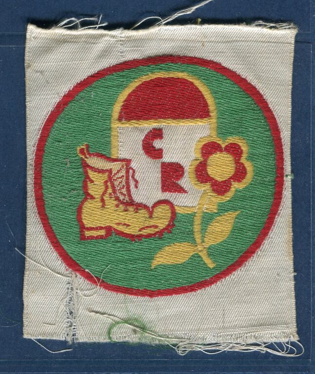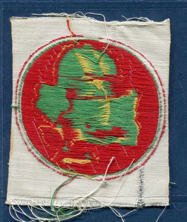 Insigne de bras circa 1940. rond 52 mm vert, rouge, blanc, jaune d'or avec dessin brodé d'une borne kilométrique, d'une fleur et une brodequin. Jamais cousu avec petit défaut de trame dans le tissus blanc hors image.