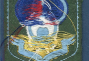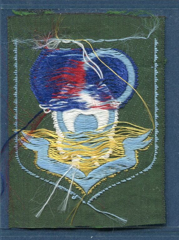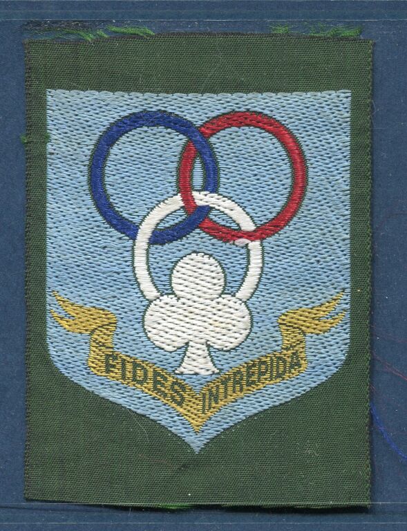 Insigne titre d'épaule soie brodée couleurs illustrée 60 x 45 mm, Blason bleu ciel avec en centre trèfle surmonté de 3 anneaux en bleu, blanc, rouge.