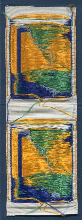 Insigne titre d'épaule soie brodée couleurs illustration torrent dans une vallée boisée, montagne au fond - 65 x 47 mm -