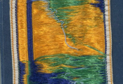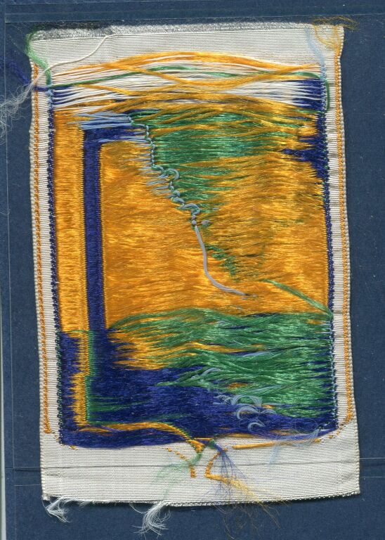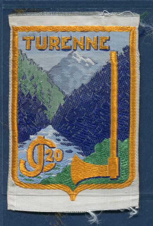 Insigne titre d'épaule soie brodée couleurs illustration torrent dans une vallée boisée, montagne au fond - 65 x 47 mm - EXEMPLAIRE NEUF JAMAIS COUSU.