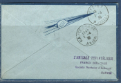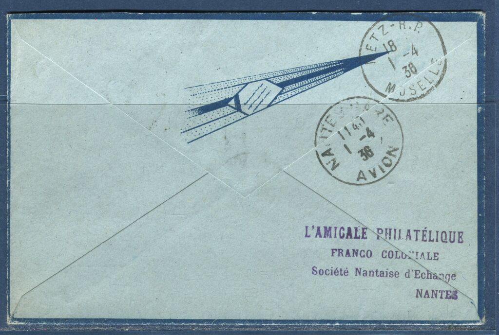 Porte étiquette triangulaire rouge PAR AVION + cachet de l'AERO CLUB de l'ATLANTIQUE, aérodrome de Nantes Chateau Dougon - Cachet à date départ NANTES GARE AVION 1er avril - au dos : cachet d'arrivée METZ R.P. même jour. - Muller n° 74.
