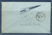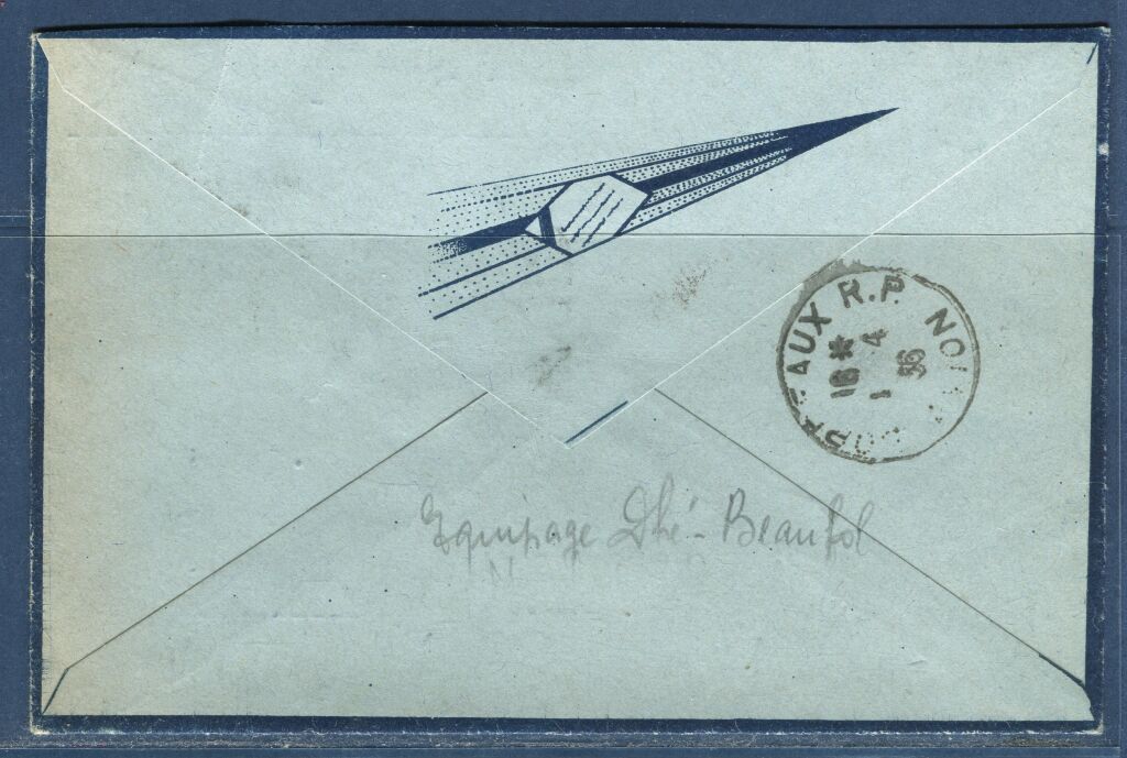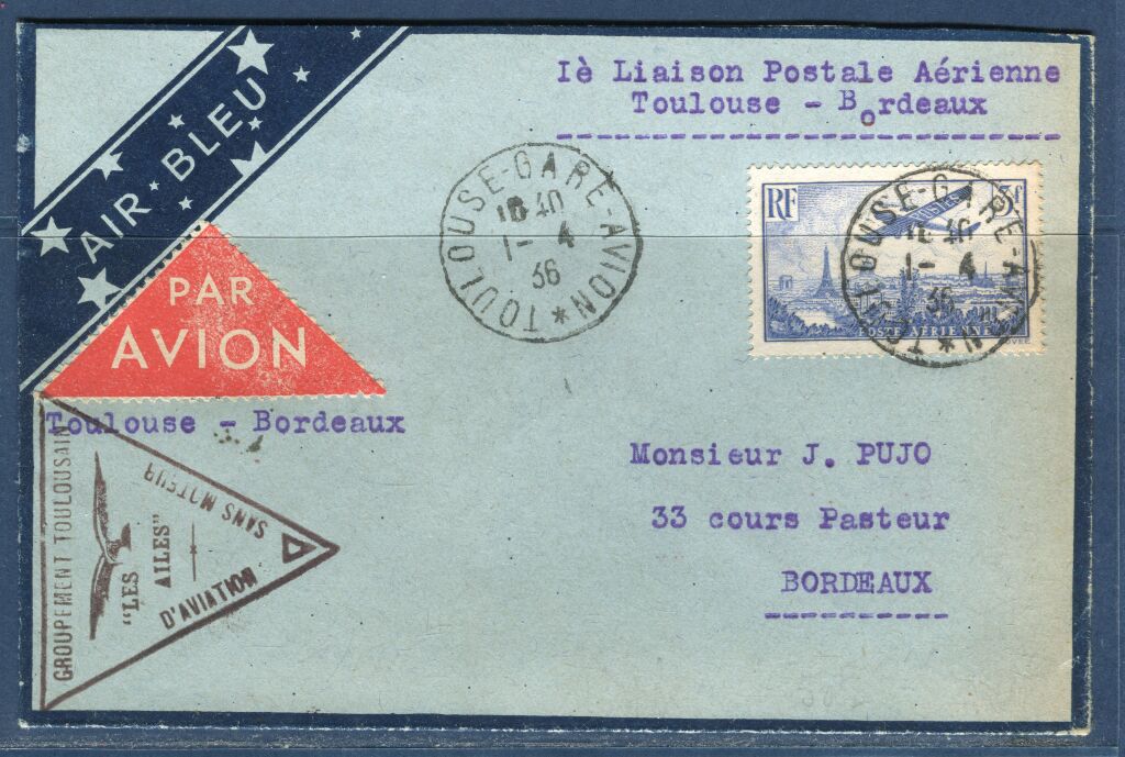 Porte étiquette triangulaire rouge PAR AVION + cachet du Groupement Toulousain d'aviation sans moteur " les ailes " - Cachet à date départ TOULOUSE GARE AVION 1er avril - au dos : cachet d'arrivée BORDEAUX R.P. AVION, même jour. -