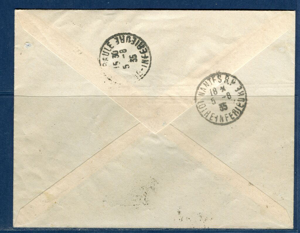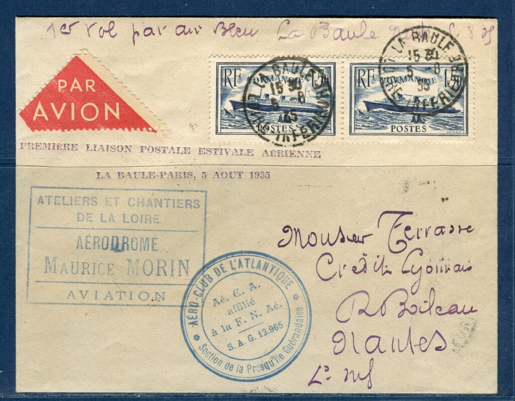 5 août 1935 - " PREMIERE LIAISON POSTALE ESTIVALE AERIENNE LA BAULE à PARIS, via Nantes - Muller n° 38 - PORTE GRIFFE SPECIALE DU VOL + cachet du camp d'aviation, grand cadre bleu, des " Ateliers et Chantiers de la Loire, Aérodrome Maurice Morin " + tampon rond 39 mm de " l'Aero Club de l'Atlantique, section de la presqu'ile Guérandaise " - Porte étiquette rouge triangulaire par avion - Cachet départ La Baule 5/8. Au dos : cachet d'arrivée à NANTES R.P. même jour. Affranchissement à 3 francs :