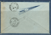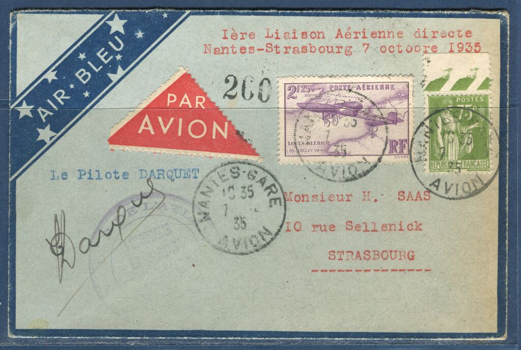 Enveloppe numérotée avec AUTOGRAPHE manuscrit à la plume du PILOTE Henri DARQUE. Cachet à date départ NANTES GARE AVION 7 octobre 1935. Porte étiquette triangulaire rouge PAR AVION - Affranchissement à 3 F : 75c type Paix vert n° 284 A + 2 F 25 traversée de la manche par Blériot n° Pa 7. - au dos : arrivée STRASBOURG TELEGRAPHE 7 octobre. - Muller n° 46.