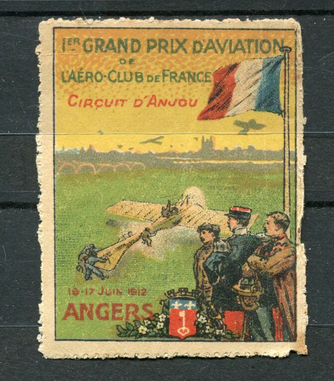 PRECURSEURS - 1er GRAND PRIX D' AVIATION de L' AERO CLUB de FRANCE - CIRCUIT D' ANJOU - ANGERS , meeting des 16 & 17 juin 1912, course Angers / Cholet / Saumur. - Vignette polychrome dentelée, 50 x 40 mm - monoplan au départ devant les officiels sous le drapeau tricolore. Au fond ville et cathédrale d'Angers, variante ciel en pointillé orange - Silombra V 2.
