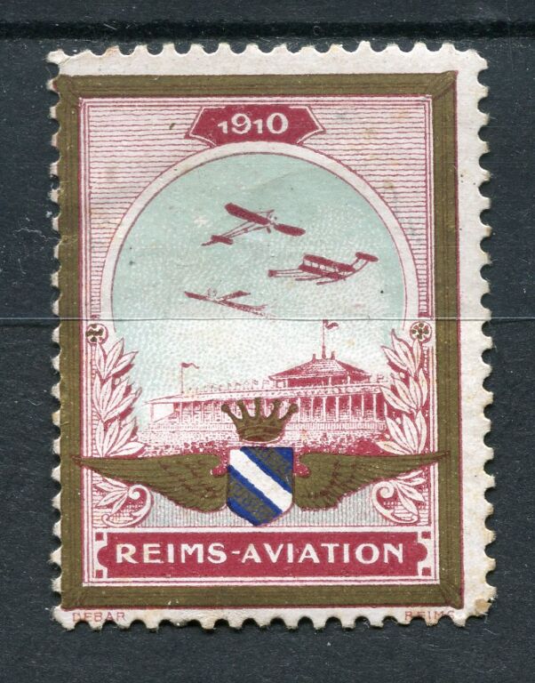 PRECURSEURS AVIATION - 2e GRANDE SEMAINE de la CHAMPAGNE, du 3 au 10 juillet 1910. - vignette dentelée du meeting, 36 x 27 mm, avions en vol en escadrille au dessus du champ d'aviation et des tribunes, plaine de Bethény - lithographie Debar à Reims. Silombra V 11