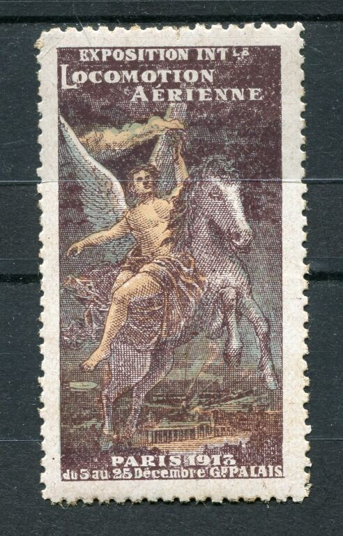 PRECURSEURS AVIATION - 5E Exposition de la LOCOMOTION AERIENNE au Grand Palais à PARIS, du 5 au 25 décembre 1913 - Vignette dentelée de propagande 53 x 29 mm, Icare ailé sur un cheval cabré (variante ailes bleues sur fond violet. Silombra V 1