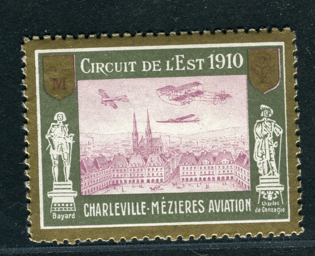 PRECURSEURS AVIATION - COURSE du CIRCUIT de L'EST, 3e étape, 100 Km de Nancy à Charleville du 11 au 12 août 1910 - Vignette dentelée du meeting, les avions au dessus de la Grande Place de Charleville-Mézières ; à gauche statue de Bayard sous les armes de Mézières, à droite statue de Charles de Gonzague sous les armes de Charleville.