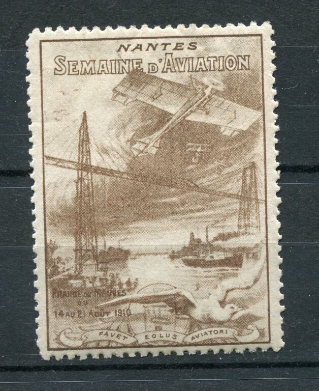 PRECURSEURS AVIATION - MEETING de NANTES, à la Prairie des Mauves, du 14 au 21 août 1910 - Vignette dentelée du meeting, 47 x 36 mm, monoplan en vol au dessus du Port et du Pont Transbordeur, impression Dugas à Nantes, dessin de G de Passorio-Peyssard. - en brun clair, Silombra V 5.