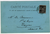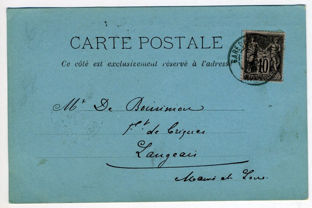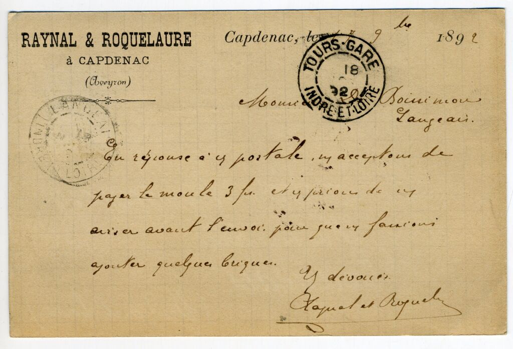 carte postale avec verso correspondance à entête imprimée - Recto carton teinté bleu avec mention " carte postale " et " ce coté est exclusivement réservé à l' adresse " pour respecter le modèle officiel de l' administration. Carte postale expédiée à la fabrique de briques et faïences de LANGEAIS (37) de Mr Boissimon. Affranchissement 10c noir au type Sage (n° 89), cachet à date départ GARE de CAPDENAC 17 novembre 1892 ; CAD transit TOURS GARE 18/11 et CAD arrivée Langeais.