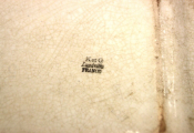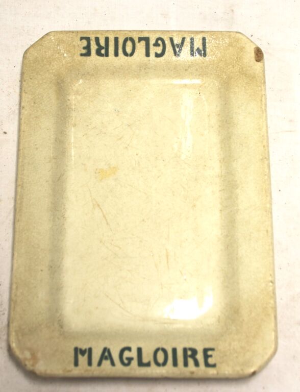PUBLICITE - CALVADOS - Plat publicitaire "MAGLOIRE" en faïence crème et texte en vert, marquage "K et G Lunéville" - Petites écaillures.