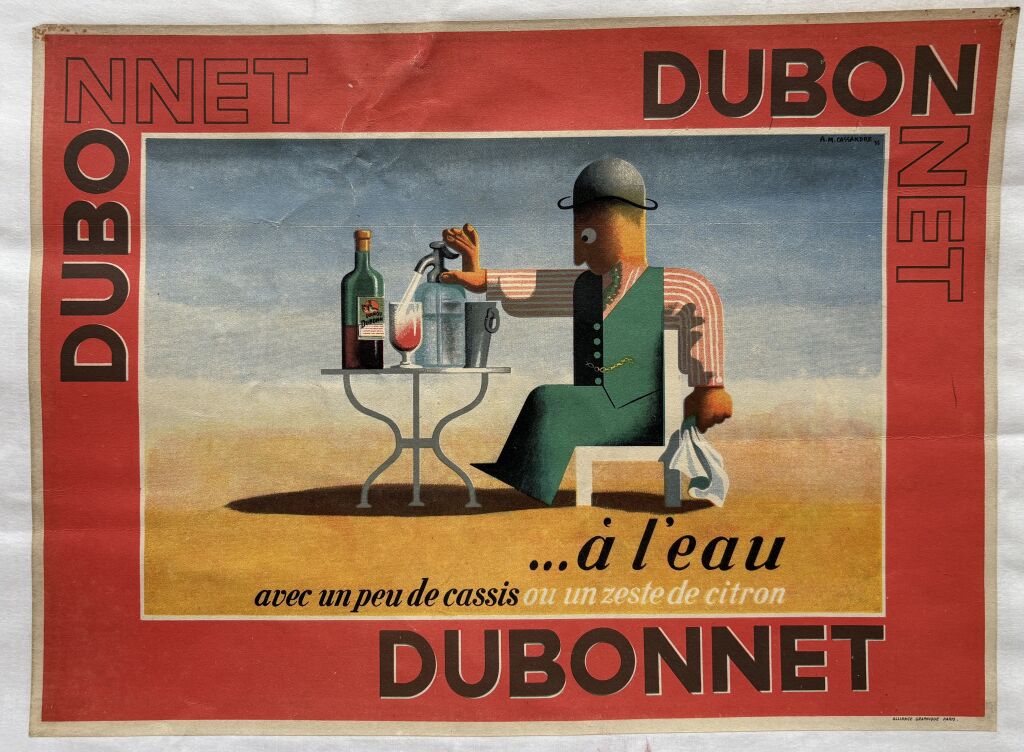 PUBLICITE … DU BON DUBON DUBONNET ;;; à l'eau, un peu de cassis ou un zeste de citron - Illustration 1935 de CASSANDRE - 26,5 x 35,5 cm - entoilé.