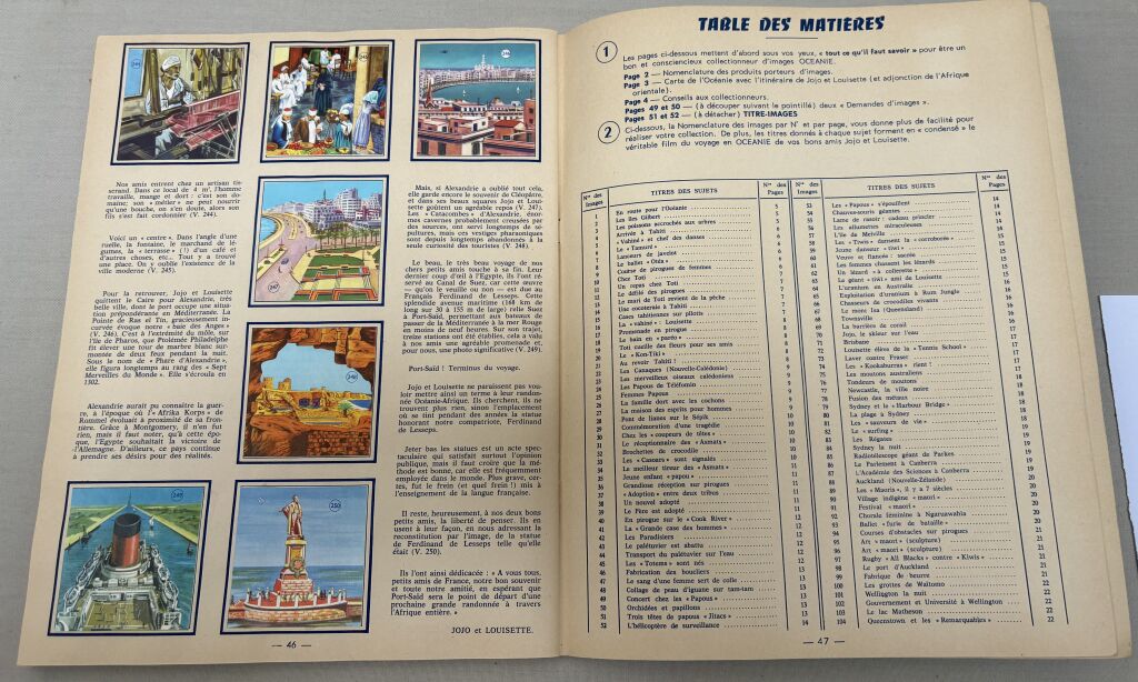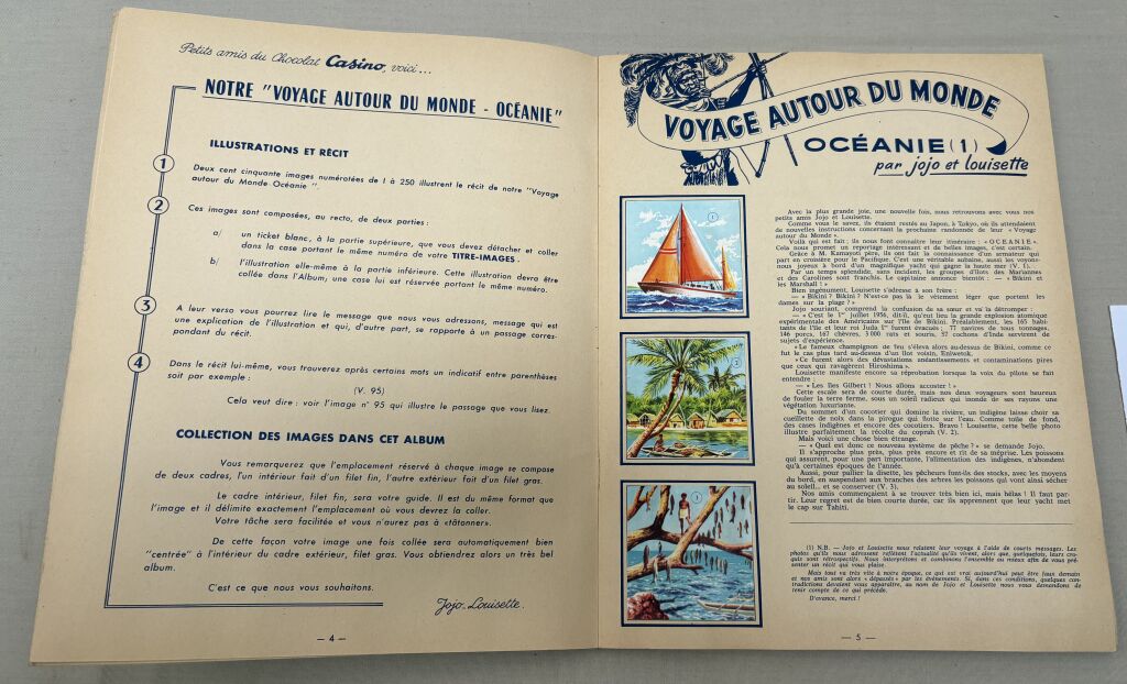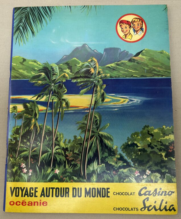PUBLICITE - ENFANTINA - ALBUM 1960, " VOYAGE AUTOUR du MONDE - OCEANIE " des " CHOCOLAT CASINO " et " CHOCOLATS SCILIA " - 50 pages, complet de ses 250 images IN TEXTE " Jojo et Louisette nous relatent leur voyage … les photos qu'ils nous adressent reflètent l'actualité qu'ils vivent... cela nous promet un reportage intéressant .. a bord d'un magnifique Yacht..."