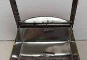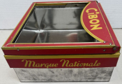 Boite fer sérigraphie couleur rouge et jaune.23,5 x 22 x 5,5 cm, permettait à l'épicier de vendre au détail une boite de biscuits (style petit beurre ou biscuit breton).