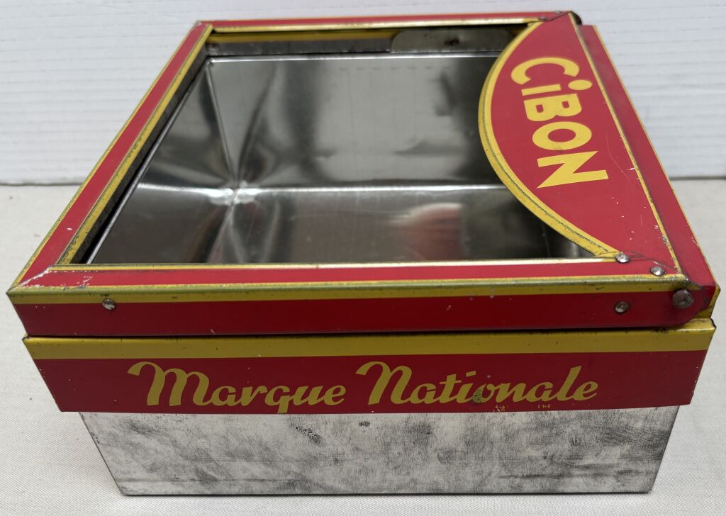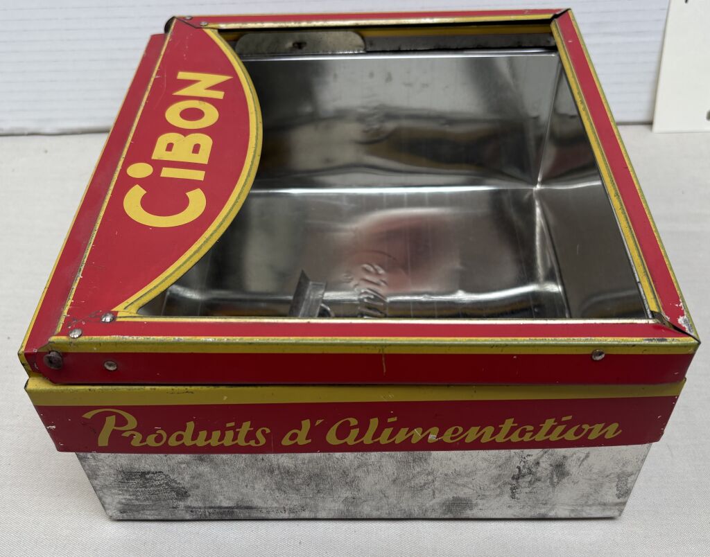 En remplaçant son couvercle d'origine par cette surboite, ouvrante avec charnières, permettait de montrer le produit tout en sauvegardant l'hygiène. Verre à rajouter.