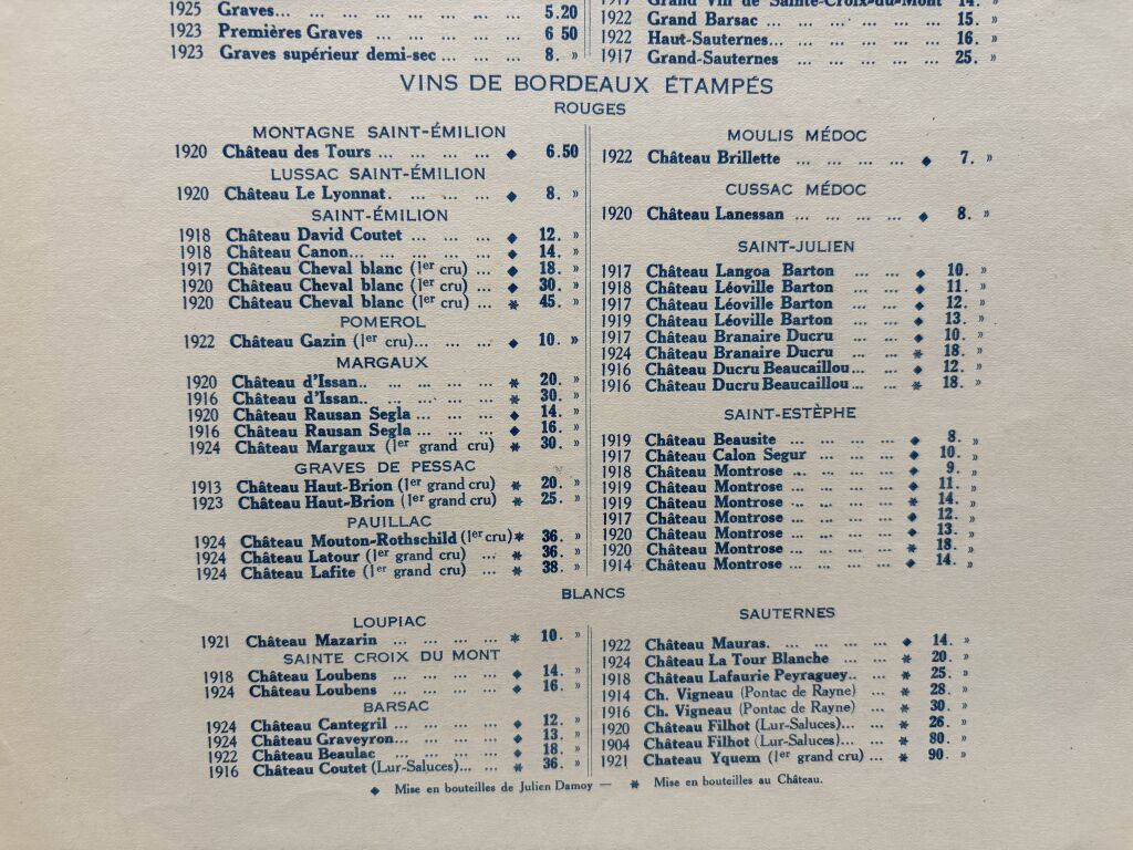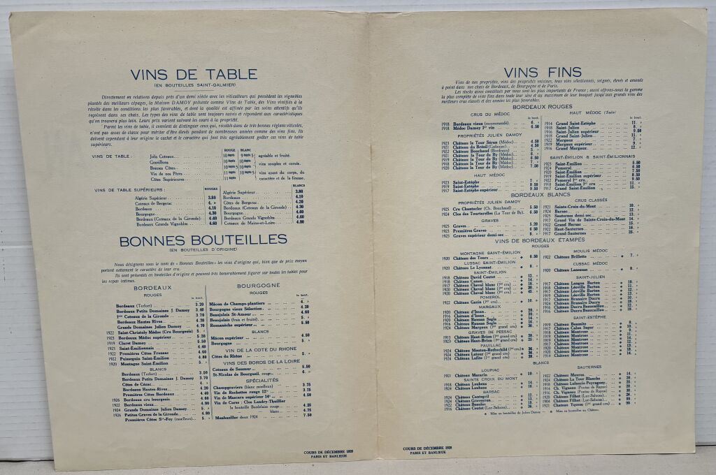 4 pages ouvrantes (fermé 38 x 27,5 cm) tarif pour les vins de table et les bonnes bouteilles, les grands Bordeaux (Yquem 1921 90 francs, Cheval blanc 1920 45 francs...), les grands Bourgognes, les vins de Champagne...