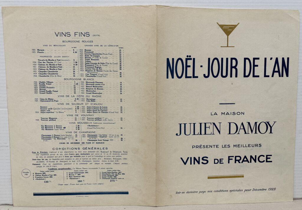 PUBLICITES VINS - NOEL / JOUR de L' AN - " LA MAISON JULIEN DAMOY vous présente LES MEILLEURS VINS de FFRANCE - Prix courant DECEMBRE 1928.