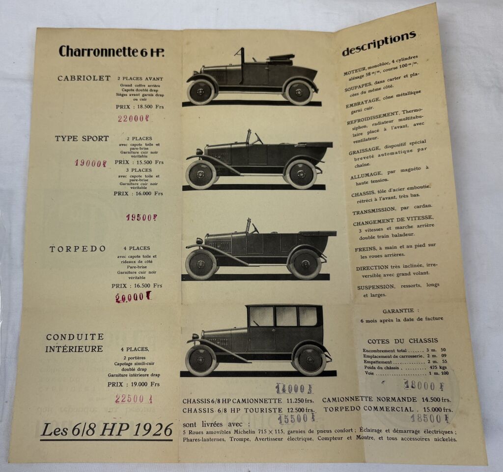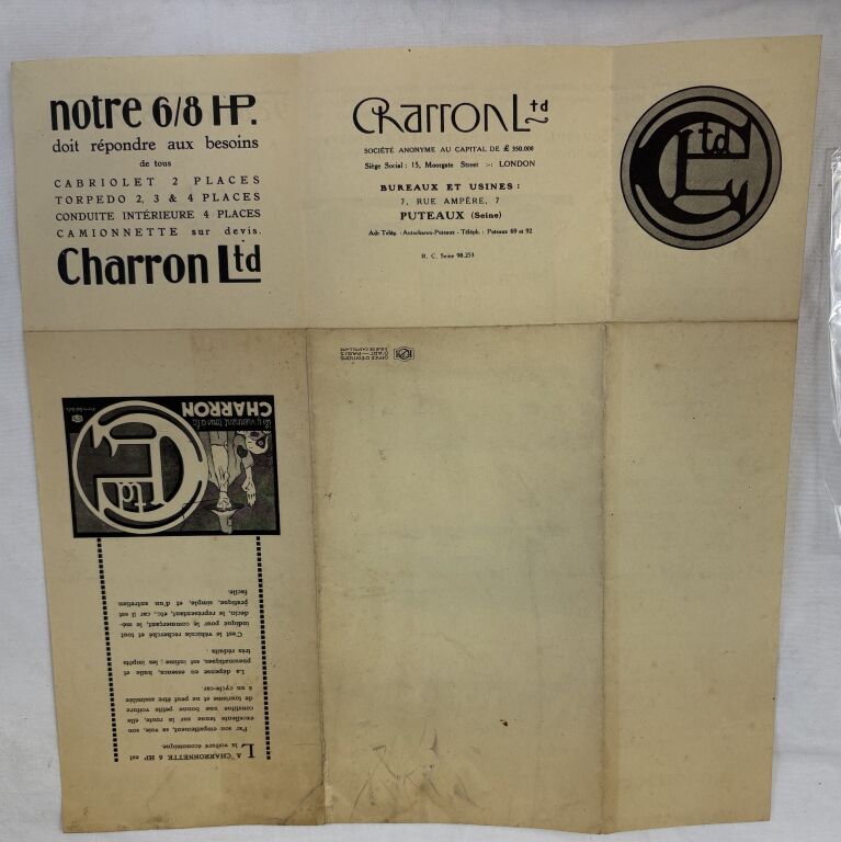 PUTTEAUX (92) - AUTOMOBILES CHARRON ( * ) - rare document publicitaire et tarif des modèles de la CHARRONNETTE 6 HP, automobiles du constructeur, avec tarifs et descriptifs techniques, photographies des modèles. Six volets recto & verso pour :