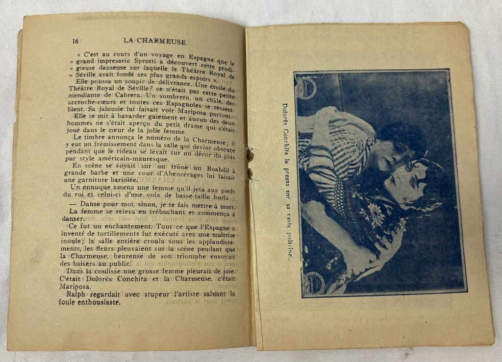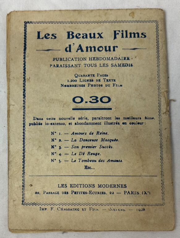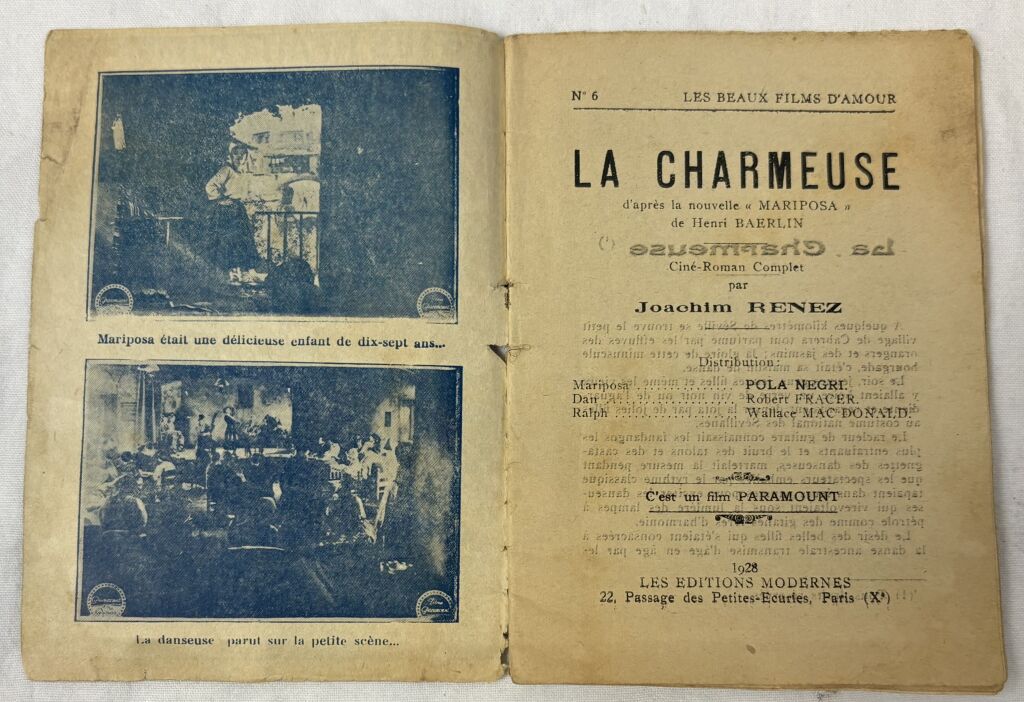" Publication hebdomadaire paraissant tous les samedis -0,30 F- 40 pages, 1200 lignes de texte - nombreuses photos du film - les ed modernes 1928, 22 passage des petites écuries à Paris - Scénario et dialogues du film d'après la nouvelle Mariposa.