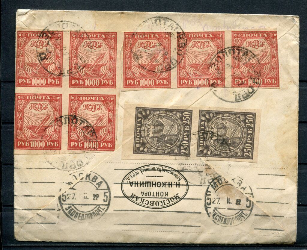 Lettre de Moscou pour Moscou, cachet départ 27 février 1922 - Intéressante période d' inflation avec un affranchissement à 7 500 roubles composé de 9 timbres de la série des attributs (n° 146 x 2 plus n° 149 sept timbres).