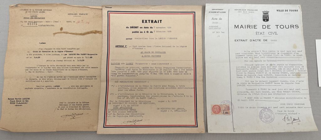 - à l'entête du Ministère de la Défense avis de décret portant nomination dans la Légion d'' HONNEUR de Lapaire née Pageot avec citation : " magnifique patriote, membre des F.F.C. Arrêtée pour faits de Résistance le 23 juillet 1944, a été internée jusqu'au 9 août 1944, puis déportée le 10 août 1944 dans un camp de concentration jusqu'au 15 mai 1945, date à laquelle elle a été portée disparue " - Ces nominations comportent : croix de Guerre avec palme, à titre posthume + l'attribution de la médaille de la Résistance.