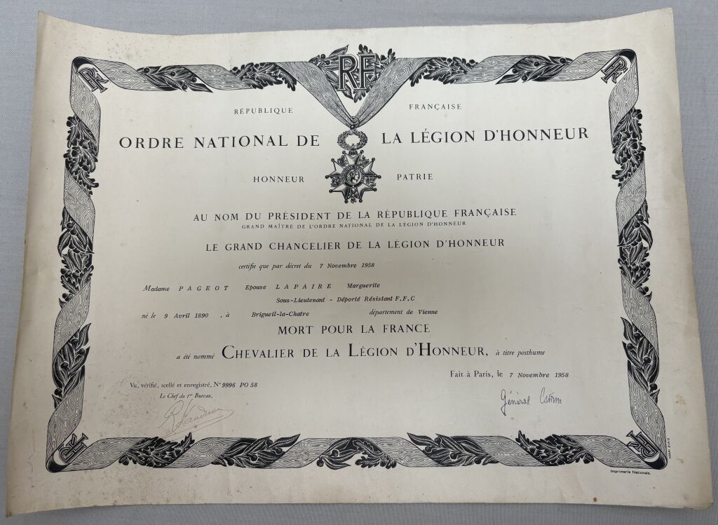 Le Grand Chancelier de la Légion d'Honneur à nommé madame PAGEOT épouse Lapaire Marguerite, Sous Lieutenant, Déporté Résistant Forces Françaises Combattantes - Chevalier de la Légion d'Honneur à titre posthume... le 7 novembre 1958, signé Général CATROUX, grand Chancelier.