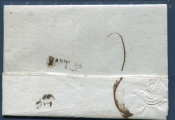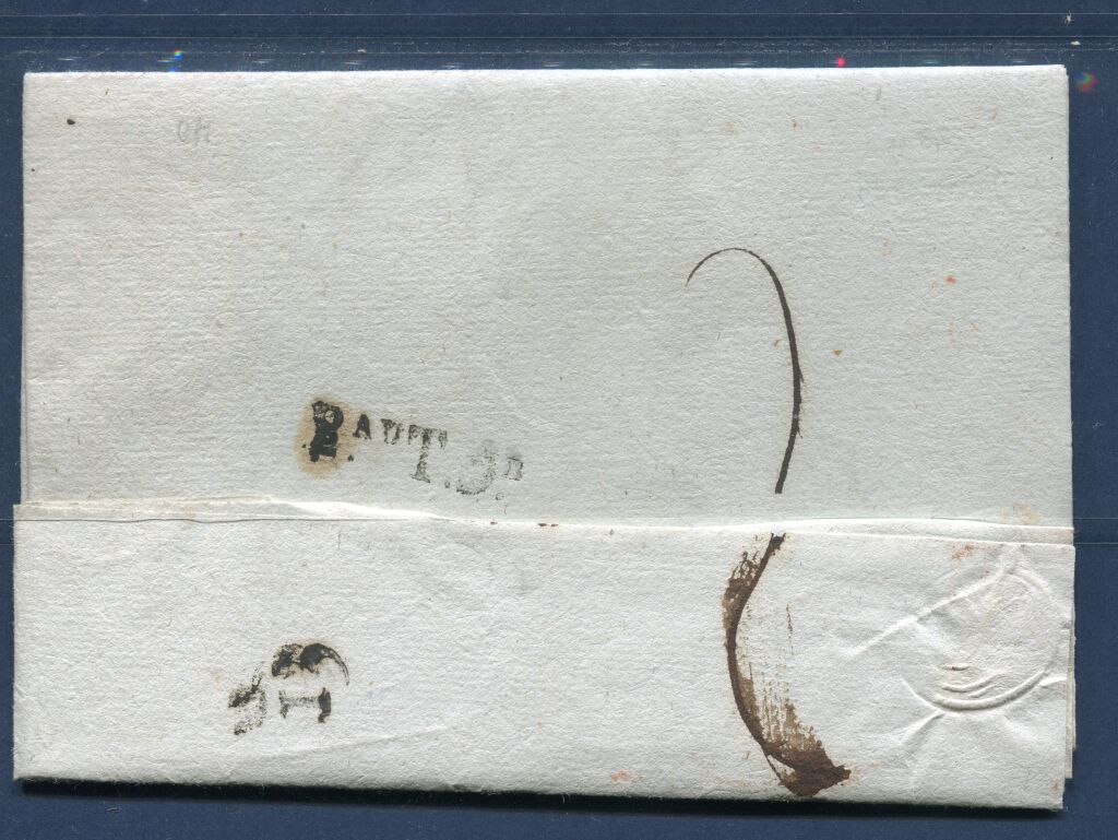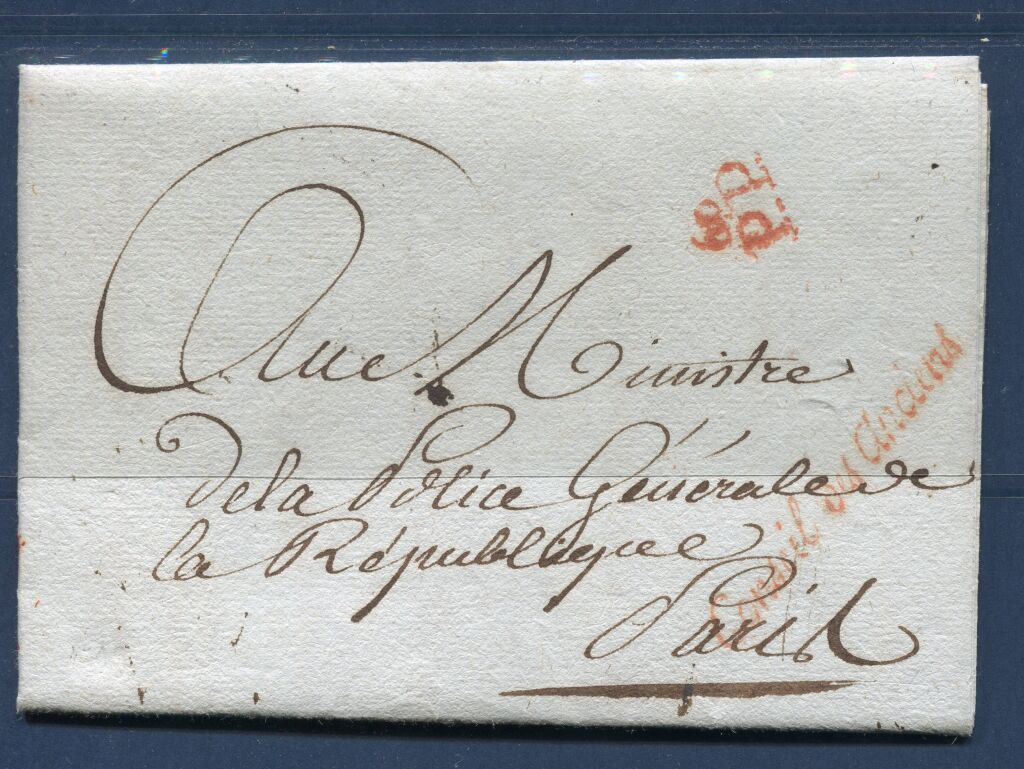REVOLUTION FRANCAISE - DIRECTOIRE - MARQUE de DEPART, frappe en rouge, texte en lettres cursives " CONSEIL DES ANCIENS " - Lettre personnelle de Lapotaire, membre du Conseil d' HENNEBONT - Morbihan - datée (31 juillet 1799) - PLI en PORT PAYE avec tampon " 60 P.P. " en rouge - au dos, à titre de réception, quantième 13 et marque " B ad T 3 E ", marque de réception de l'Hôtel des Postes de Paris (bureau T) pour les lettres en port payé provenant des départements.