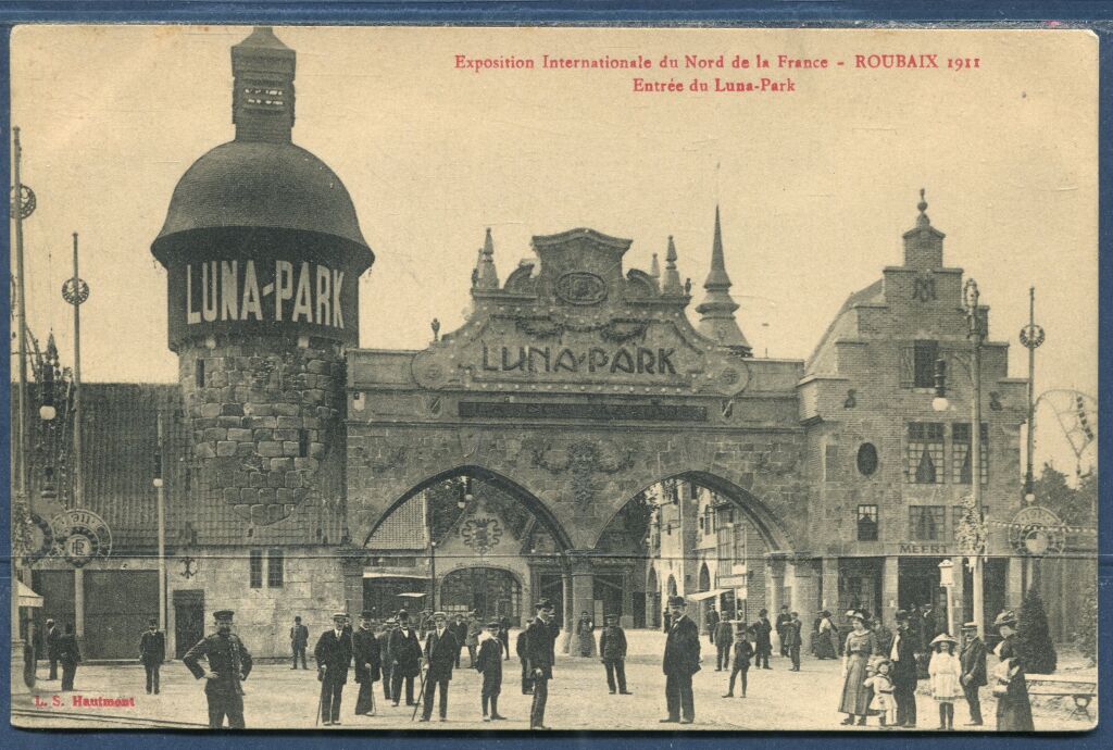 ROUBAIX (59) - EXPOSITION 1911 du NORD de la FRANCE ( * ) -"ENTREE du LUNA PARC" - Carte postale "officielle" des éditions Laffineur-Samin - Très gros plan animé, vue prise depuis l'intérieur de la place flamande, à droite la pâtisserie Meert.