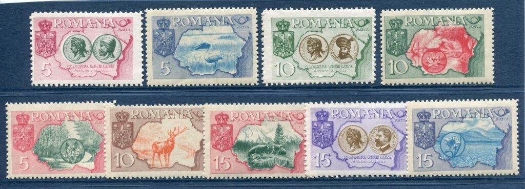ROUMANIE ROYALE EN EXIL 1954 / 1955 - Émission de 9 timbres de propagande politique destinés à récupérer des fonds pour les exilés contraints à fuir le régime le régime communiste : carte de la Roumanie Royale, y compris la Moldavie annexée par l' U.R.S.S. en 1944, avec en centre paysages et fleurs, monnaies antiques romaines, cerf, ours, pélican...