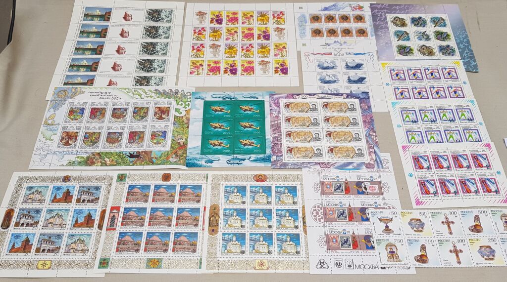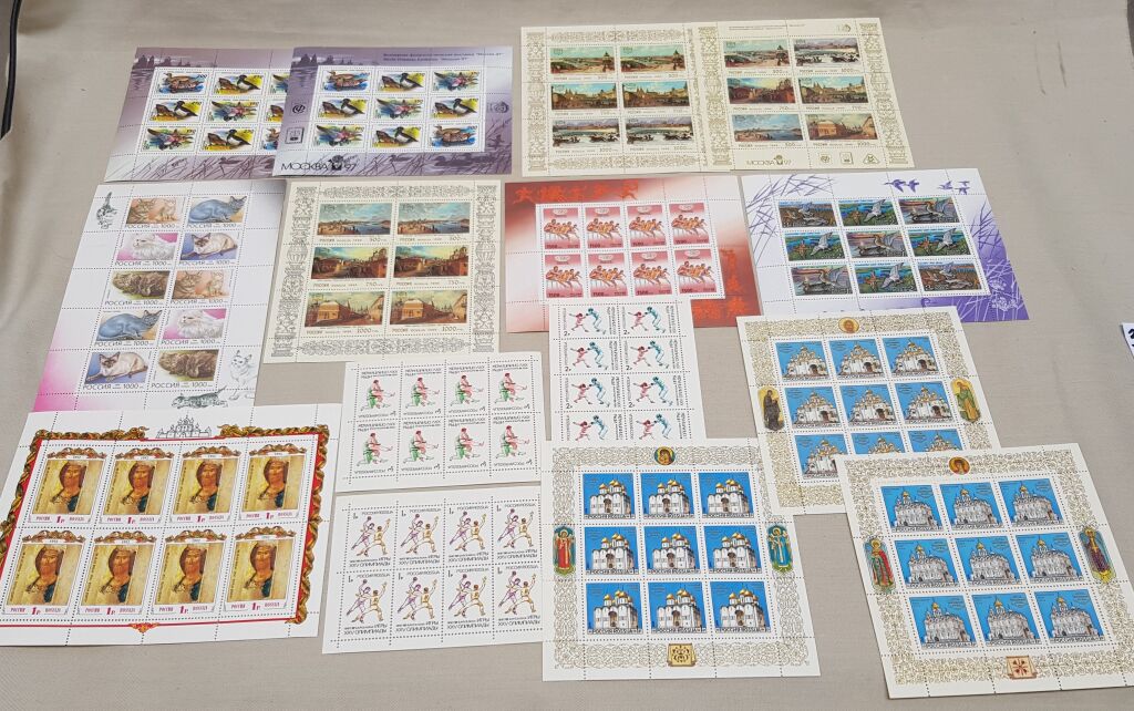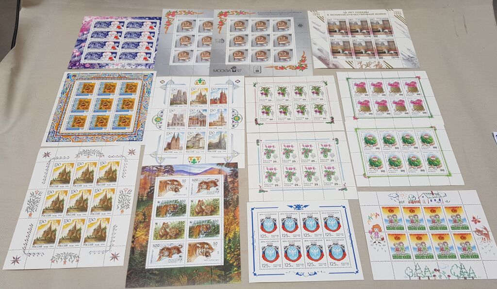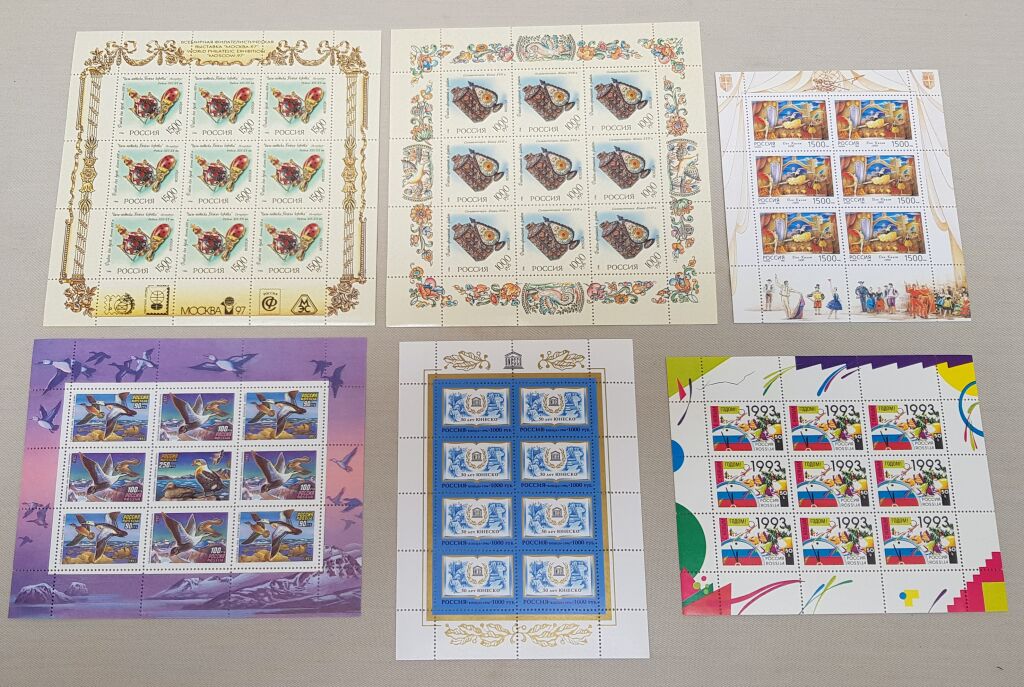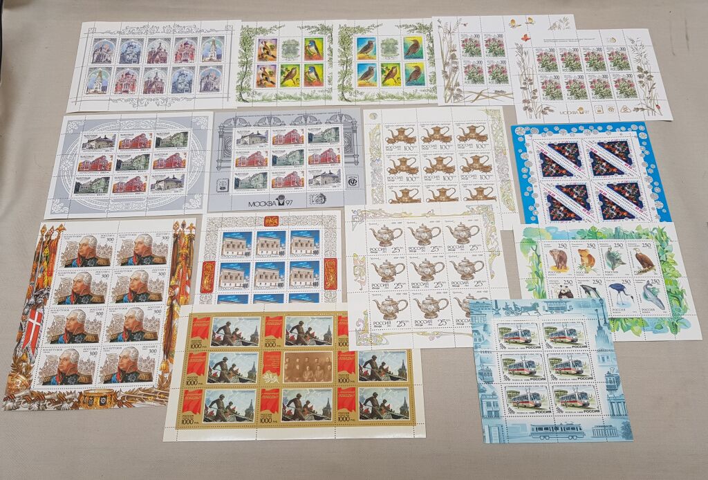 RUSSIE, années 90, rare collection de 66 (soixante six ) émissions en mini-feuilles complètes avec bordures décorées et / ou inscriptions commémoratives. Timbres neufs **, très forte valeur Yvert, beaucoup de feuillets entre 20 et 65 euros Yvert la pièce.