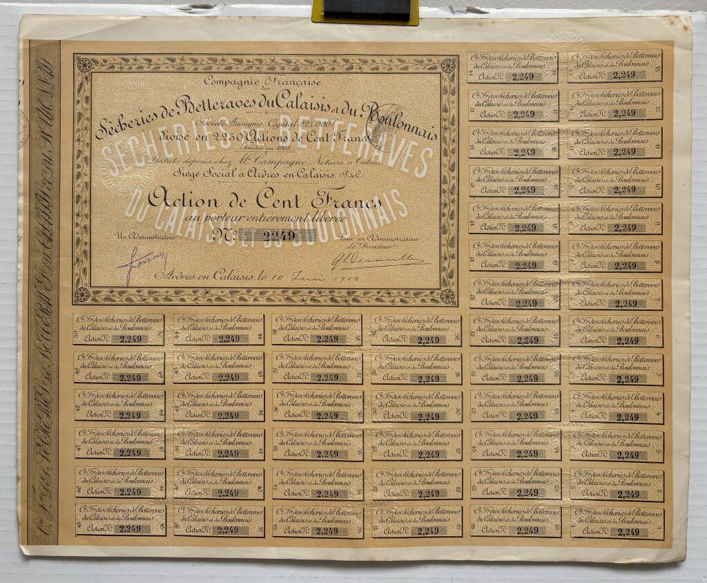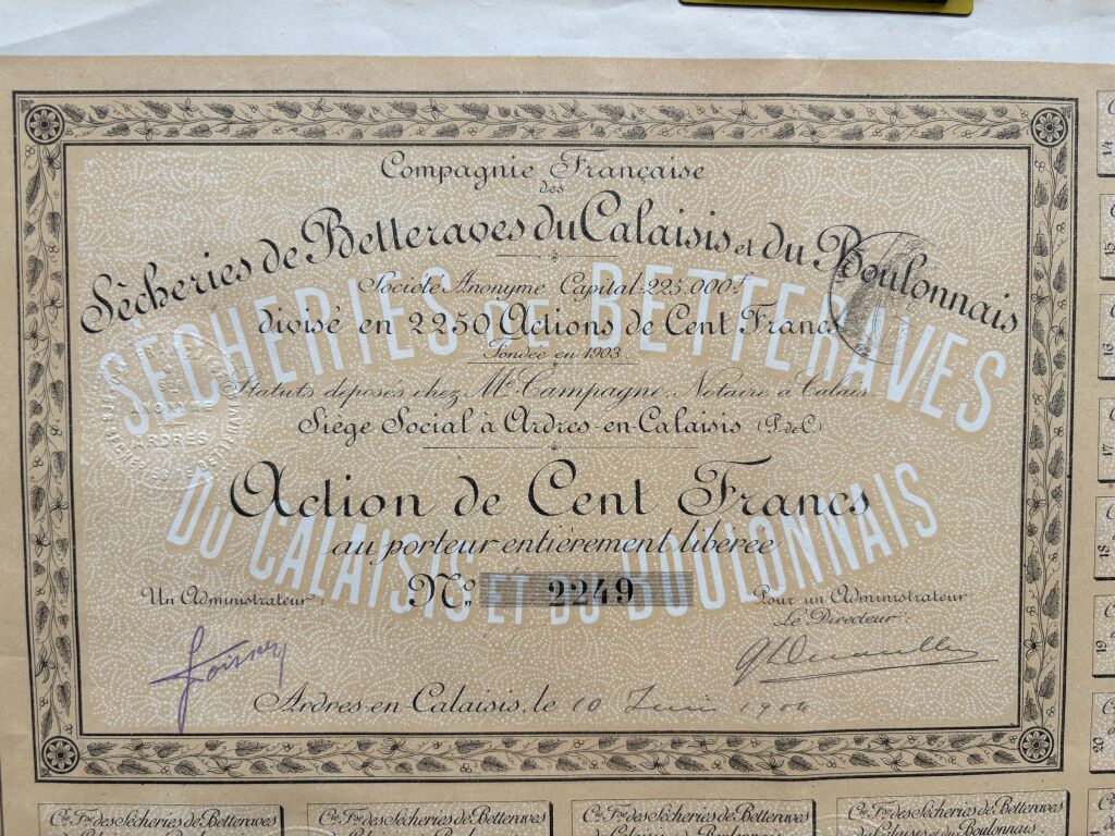 SCRIPOPHILIE - ARDRES en CALAISIS (62) - ACTION de CENT FRANCS 1903 des