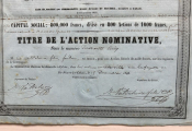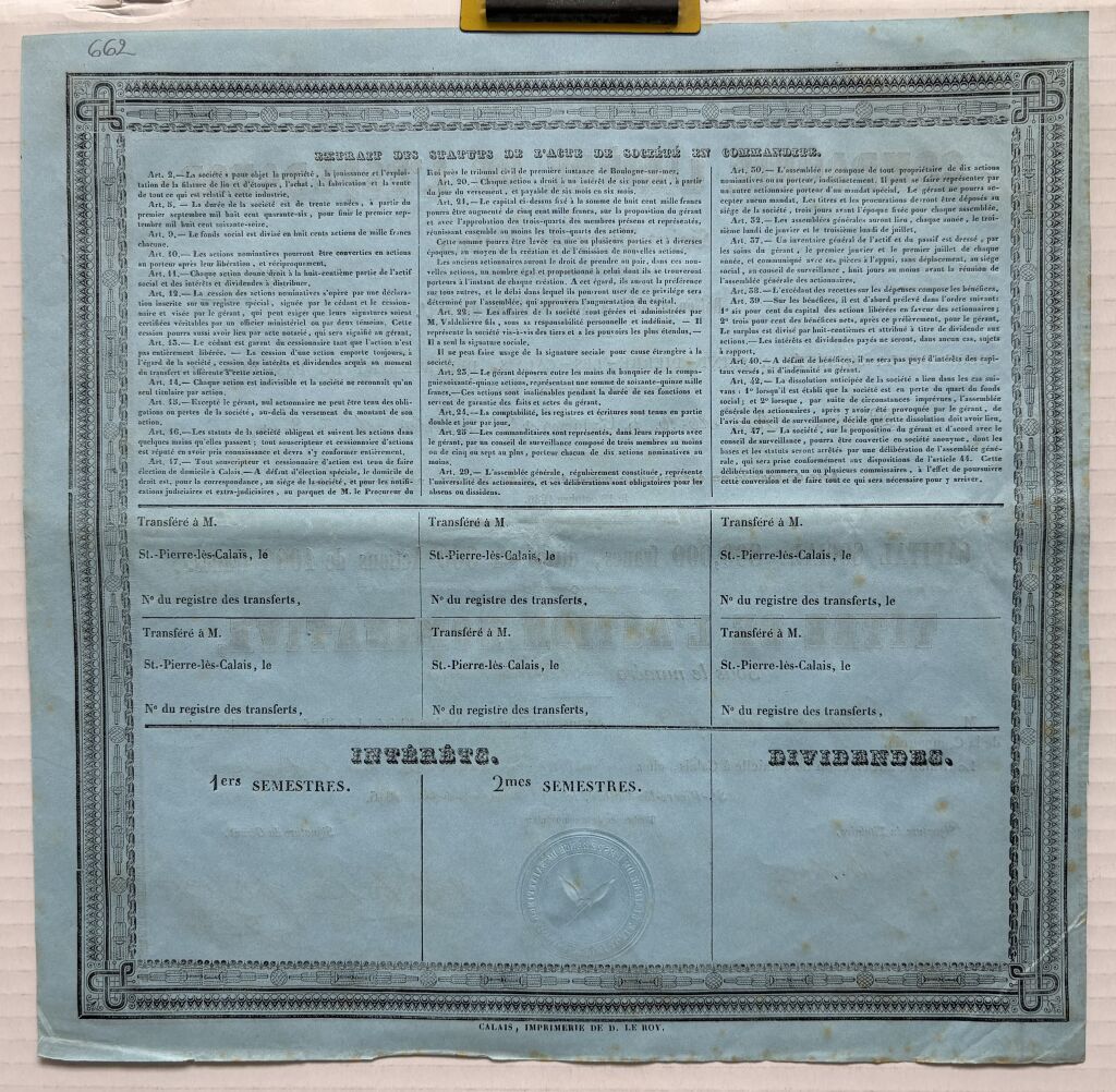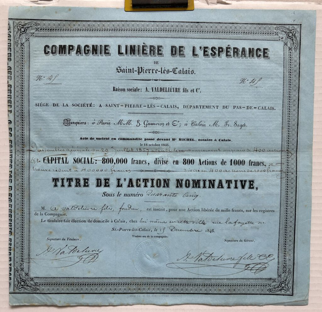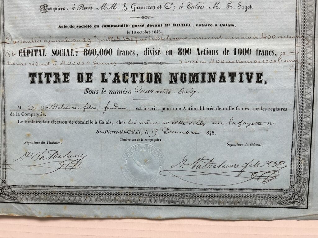 société en commandite passé devant Maître Michel notaire à Calais le 18 octobre 1846 - action rare de faible tirage 800 pièces. - Action avec signature autographe Valdelièvre pour le titulaire et Valdelièvre fils pour le gérant.
