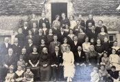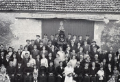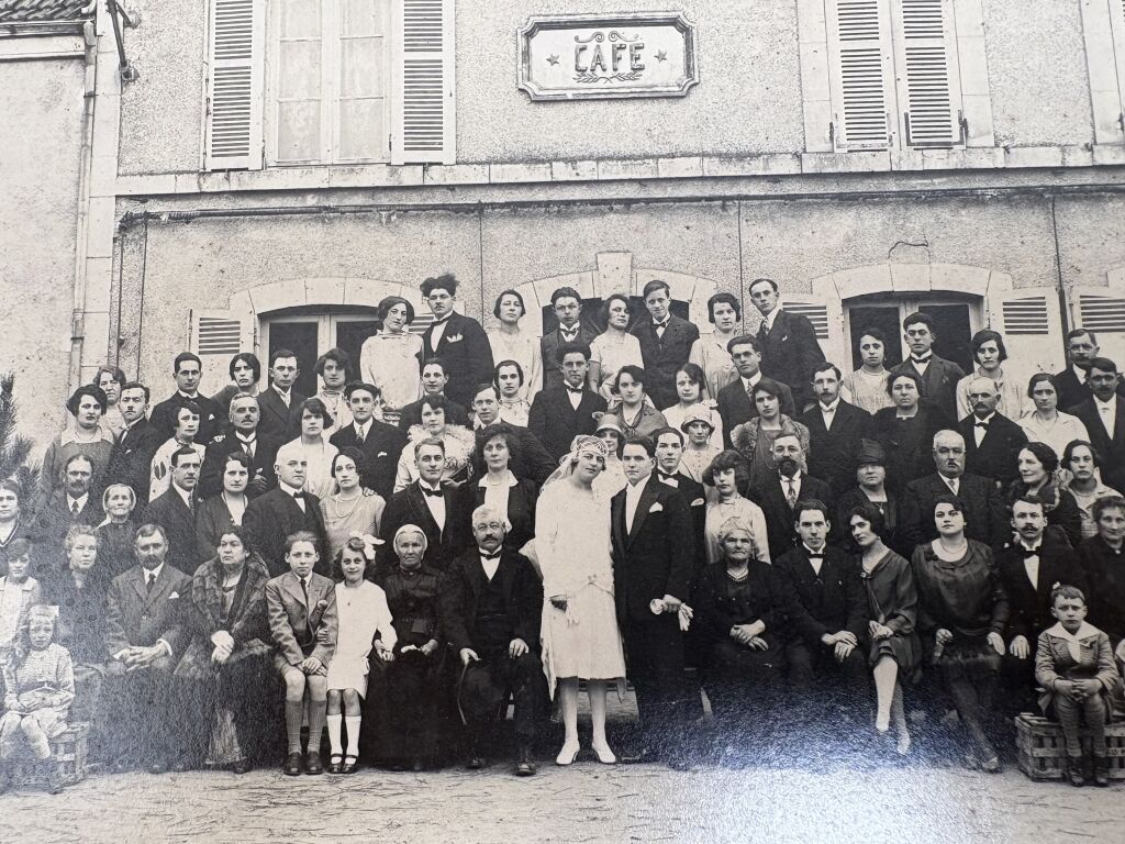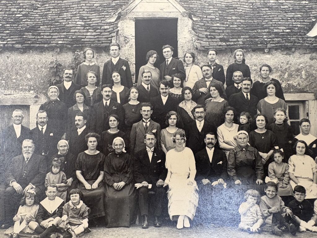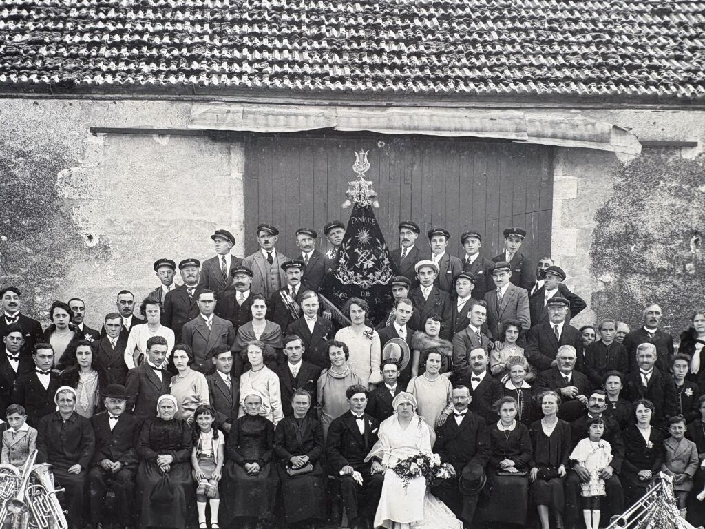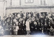 Noces complètes de diverses familles locales posant devant leur habitat " longères " ou granges, le café du village... - Toute la noce en beaux habits "du dimanche" : le marié, l'épouse, les beaux parents, les enfants, les amis et même, pour une, les musiciens de la FANFARE de CLERY avec leur bannière....