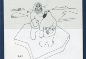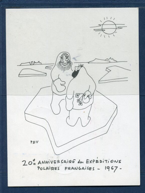 TERRES AUSTRALES et ANTARCTIQUES FRANCAISES - CARTE de VOEUX DE PAUL EMILE VICTOR pour la nouvelle année 1967 - carte postale illustration célébrant le 20e anniversaire des expéditions polaires françaises, dessin de P.E.V.