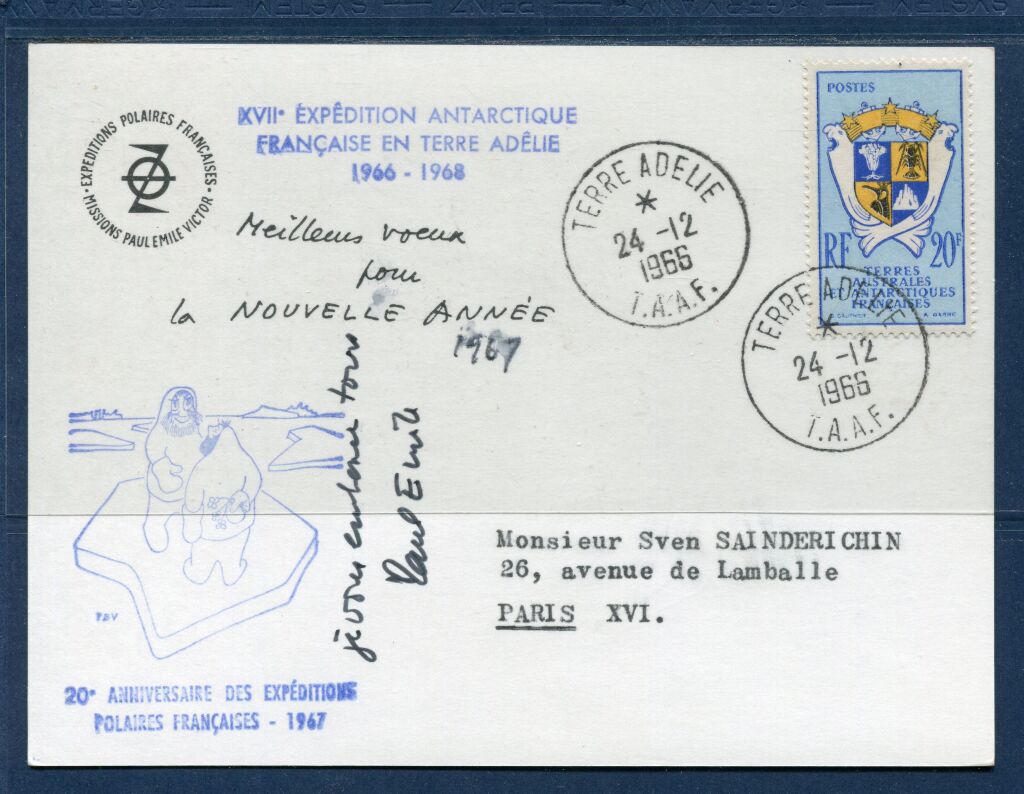 au départ de TERRE ADELIE 24 décembre 1966 avec envoi manuscrit " je vous embrasse tous " et signature " paul Émile " de Paul Émile Victor. Adressé à Paris au responsable SIMCA, fabricant des autochenilles des expéditions polaires.