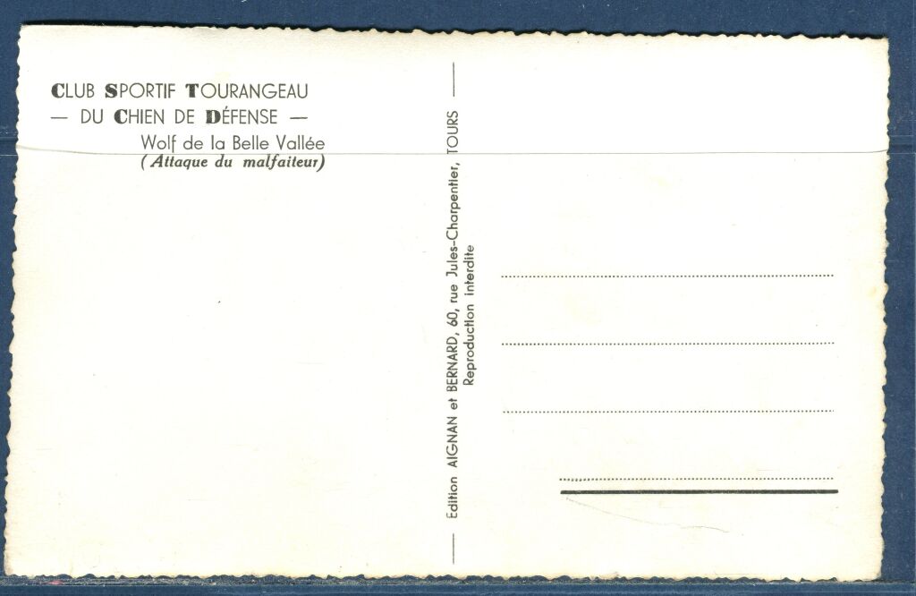 TOURS (37) - 1955 - CSTCD " Club Sportif Tourangeau du Chien de Défense ". Moniteur attaqué par le chien WOLF de la BELLE VALLEE (attaque du malfaiteur).