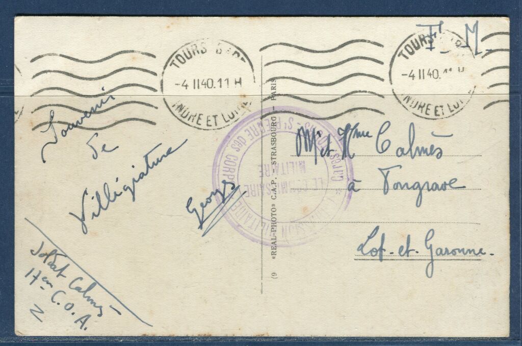 TOURS ( 37 ) - 2e Guerre Mondiale - carte postale en Franchise Militaire d'un soldat du 17e C.O.A. (commis et ouvriers militaires d'administration) en transit à Tours.