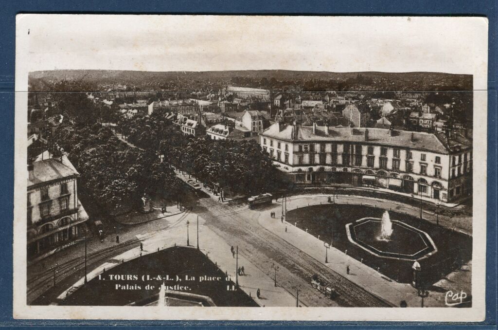 Vue : gros plan panoramique de "la place du palais de justice", vue prise de l'Hôtel de ville (CAP photo). - AU DOS : flamme en continu machine Krag 5 lignes ondulées, double bloc dateur, TOURS GARE 4 février 1940 + grand cachet à double cercle, frappe en violet, " LE COMMISSAIRE MILITAIRE / DIVISION MILITAIRE / GARES de TOURS - St PIERRE des CORPS ".
