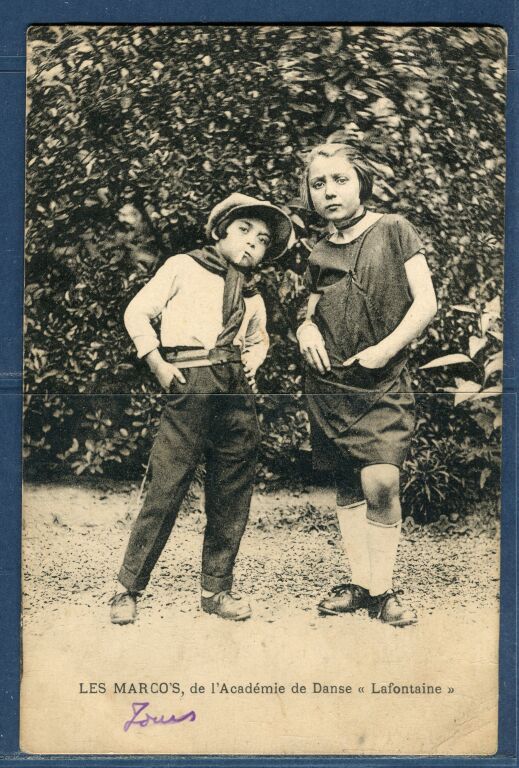 TOURS (37 ) - ACADEMIE de DANSE LAFONTAINE - " LES MARCOS ". Rare carte postale, gros plan jeune couple de danseurs vers 1920, habillés "en apaches".