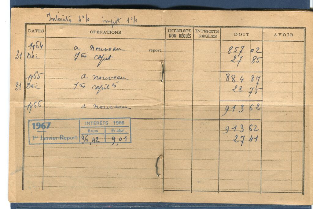 Carnet 12 pages sous couverture retraits, versements, intérêts pour la période 1955/1967 d'un compte de particulier.