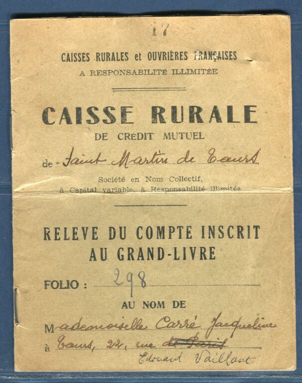 TOURS (37) - CAISSE RURALE de CREDIT MUTUEL de SAINT MARTIN de Tours, " caisses rurales et ouvrières française ", " relevé du compte inscrit au grand livre ".