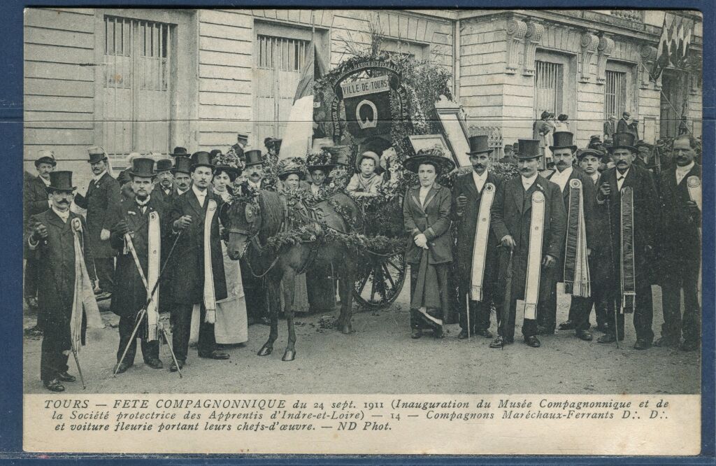 TOURS (37) - FETE COMPAGNONNIQUE du 24 septembre 1911, inauguration du musée compagnonnique & de la Sté protectrice des apprentis d' I & L - Compagnons MARECHAUX FERRANTS D.D. et voiture fleurie chargée de leurs chefs d'œuvre. Carte postale, gros plan de groupe, hommes avec leurs attributs et les mères portant écharpes - ND 14