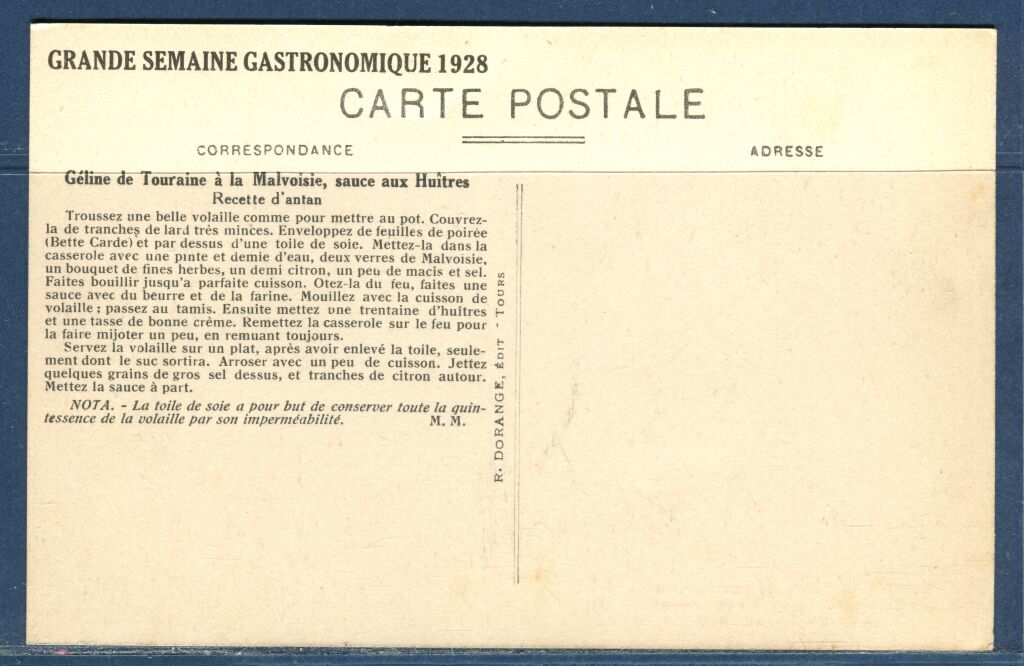 AU VERSO : RECETTE D'ANTAN de la "GELINE de Touraine à la Malvoisie, sauce aux huitres " : " troussez une belle volaille...couvrez là de tranches de lard...enveloppez de feuilles de poirée et par dessus une toile de lin...etc...mettez ensuite une trentaine d'huitres etc.. etc...".