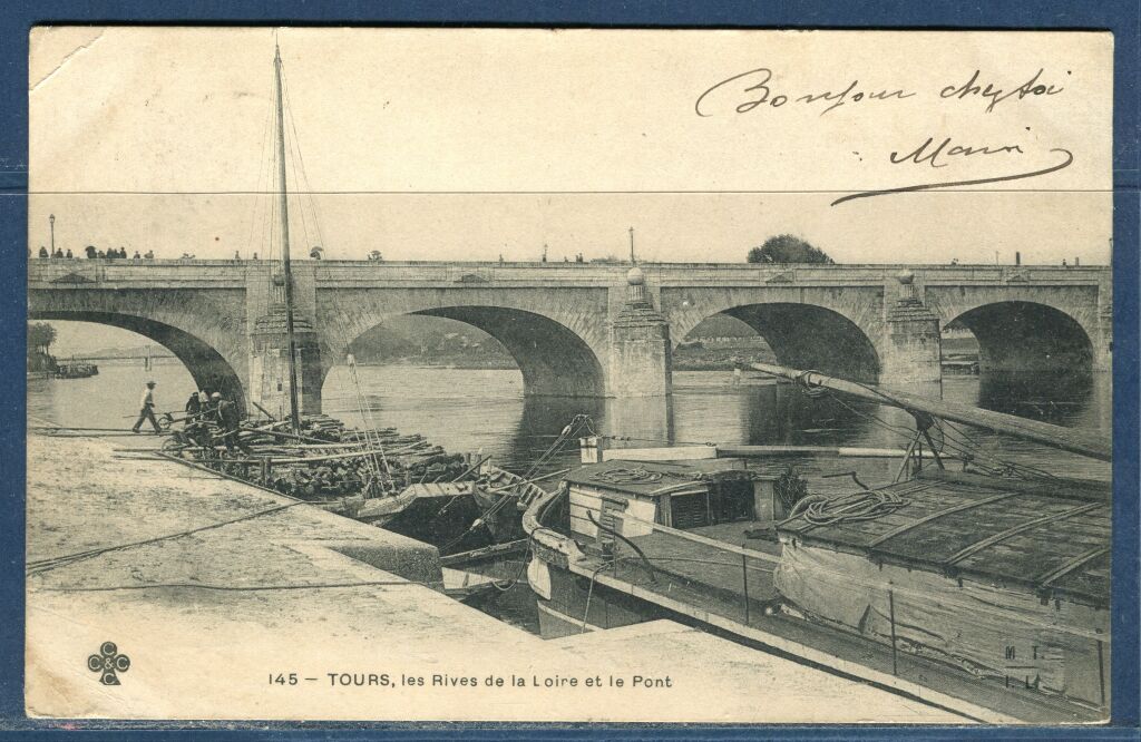 TOURS (37) - LA LOIRE NAVIGABLE - carte postale 1903, "les rives de la Loire et le pont ", en 1er gros plan les deux derniers chalands à voile de Loire, l'un au débarquement de sa charge de billes de bois, l'autre cabané - CCCC 145