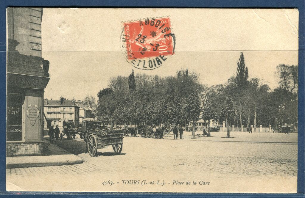TOURS (37) "PLACE de la GARE " - carte postale circa 1910/14 très inhabituelle de la ville, vue large prise du bout de la rue de Bordeaux. Permet de voir la briocherie d'angle et le fin de la place coté Heurteloup animée de ses taxis à chevaux. ? 4563