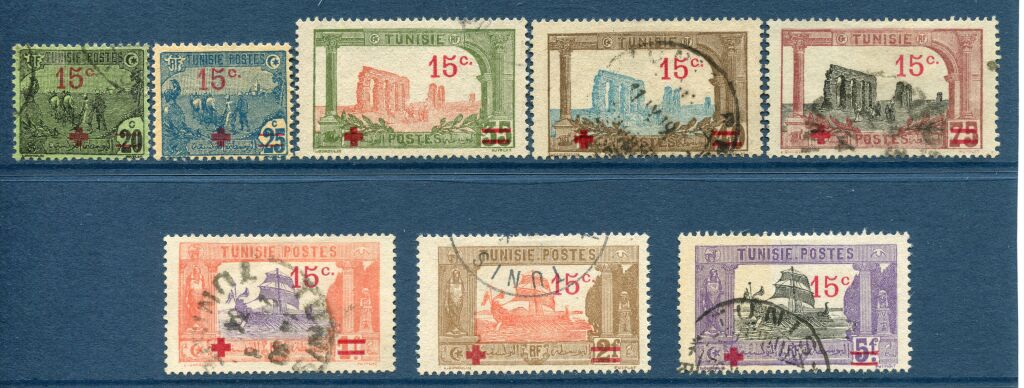 TUNISIE 1918, protectorat français - Première G.M. : " au profit des prisonniers de guerre tunisiens en Allemagne ". Timbres en cours avec surcharge d'une croix rouge et nouvelle valeur - série complète des 8 valeurs 59 à 64, belles oblitérations.